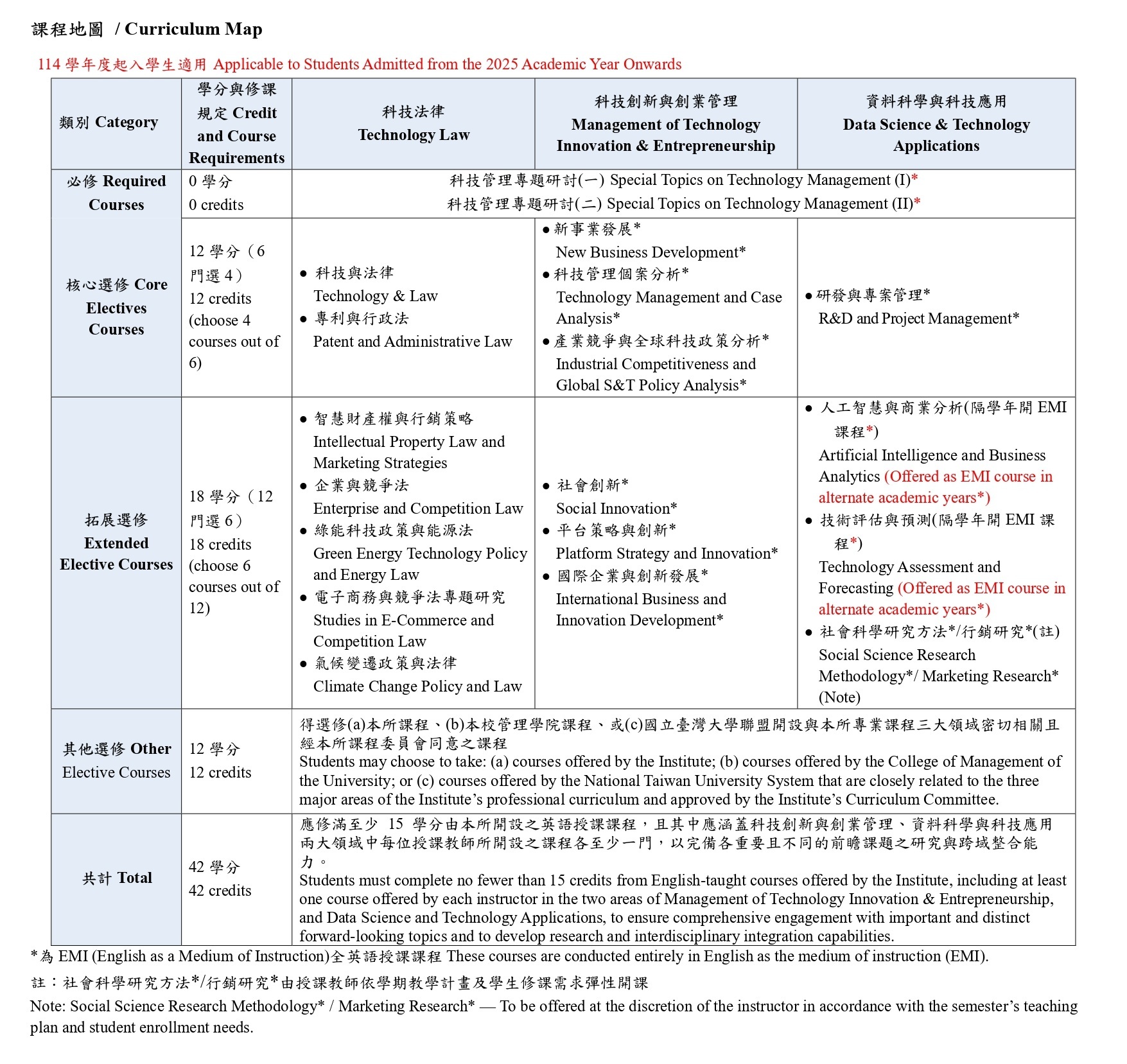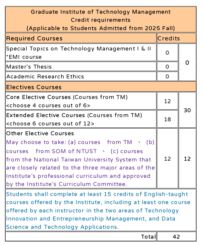 v. In the aforementioned courses, students shall complete at least 15 credits of English-taught courses offered by the Institute, including at least one course offered by each instructor in the two areas of Technology Innovation and Entrepreneurship Management, and Data Science and Technology Applications, so as to ensure comprehensive engagement with important and distinct forward-looking topics, and to cultivate research and interdisciplinary integration capabilities.
